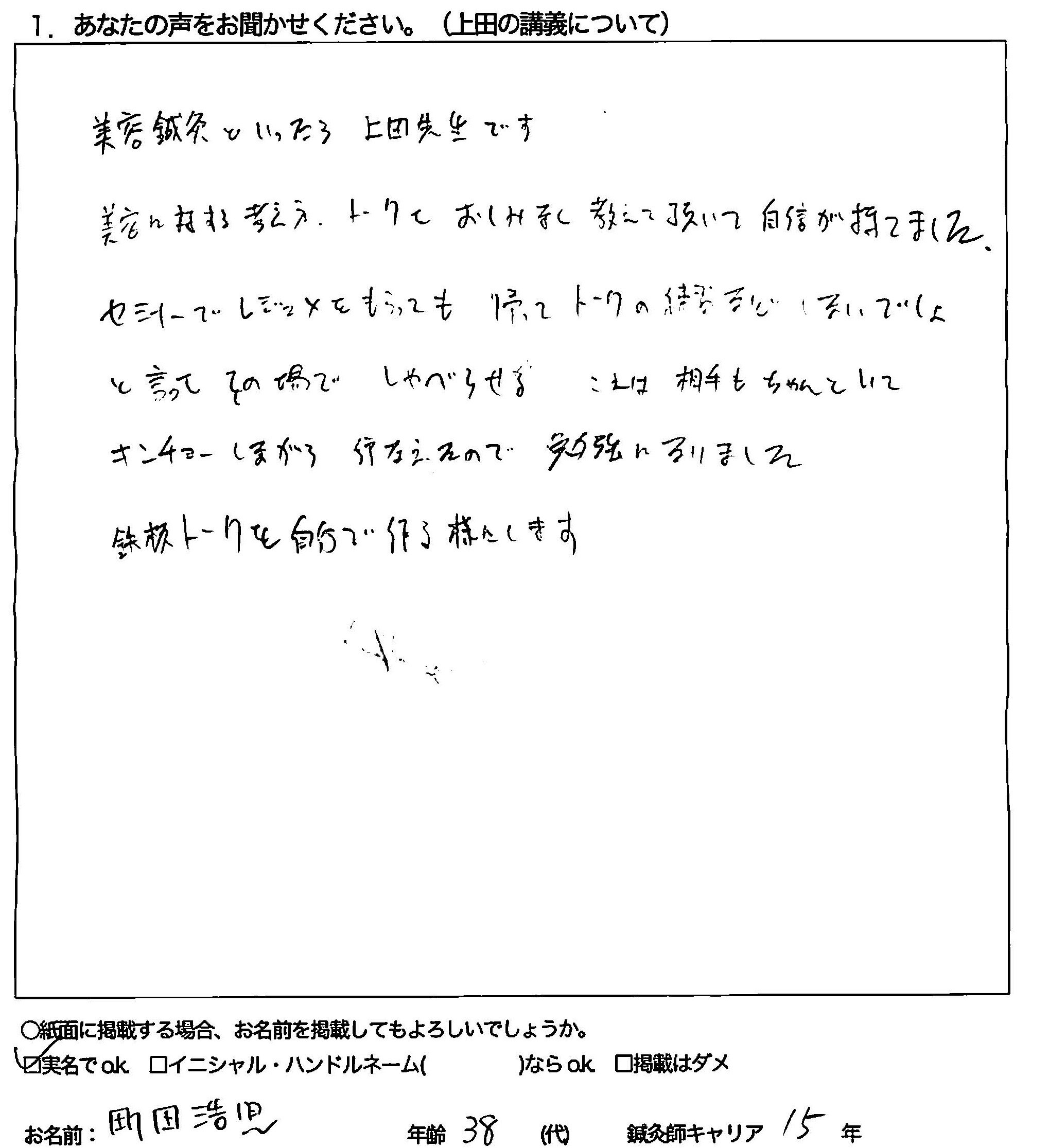 ![]() 美容鍼灸といったら上田先生です。美容に対する考え方、トークをおしみなく教えて頂いて自信が持てました。セミナーでレジュメをもらっても買えってトークの練習などしないでしょと言って、その場でしゃべらせる。これは相手もちゃんといてキンチョーしながら行えたので勉強になりました。鉄板トークを自分で作るようにします。町田浩児様 |