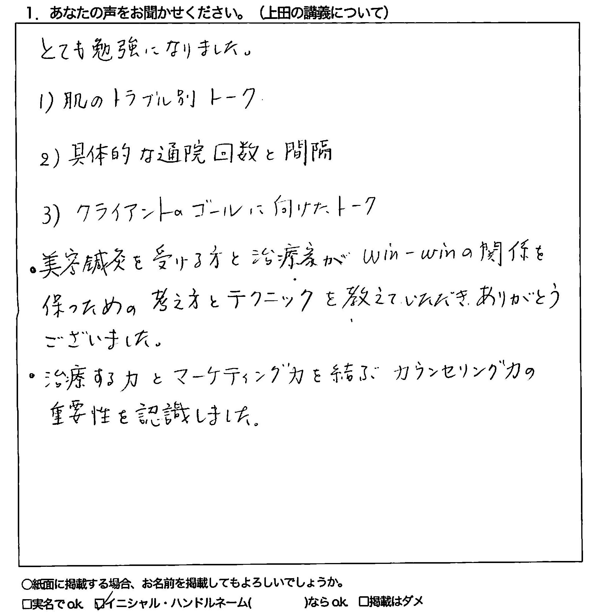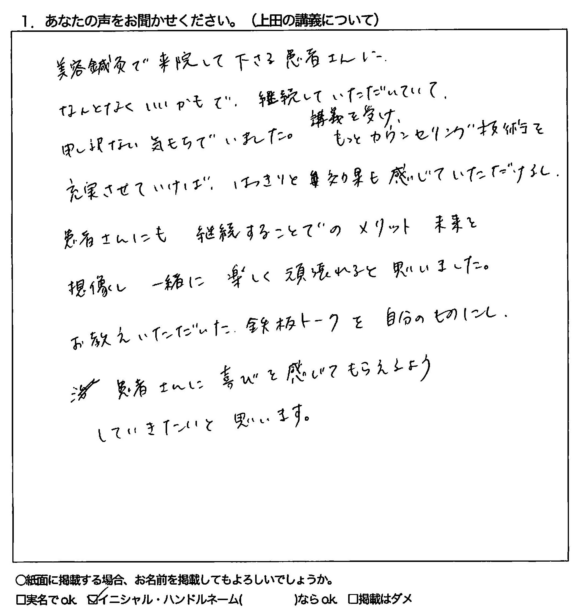 美容鍼灸で来院してくださる患者さんになんとなくいいかもで、継続して頂いていて申し訳ない気持ちでいました。講義を受けもっとカウンセリング技術を充実させていけば、はっきりと効果も感じていただけるし患者さんにも継続することでのメリット 未来を想像し一緒に楽しく頑張れると思いました。教えていただいた鉄板トークを自分のものにし患者さんに喜びを感じてもらえるようしていきたいと思います。Y様