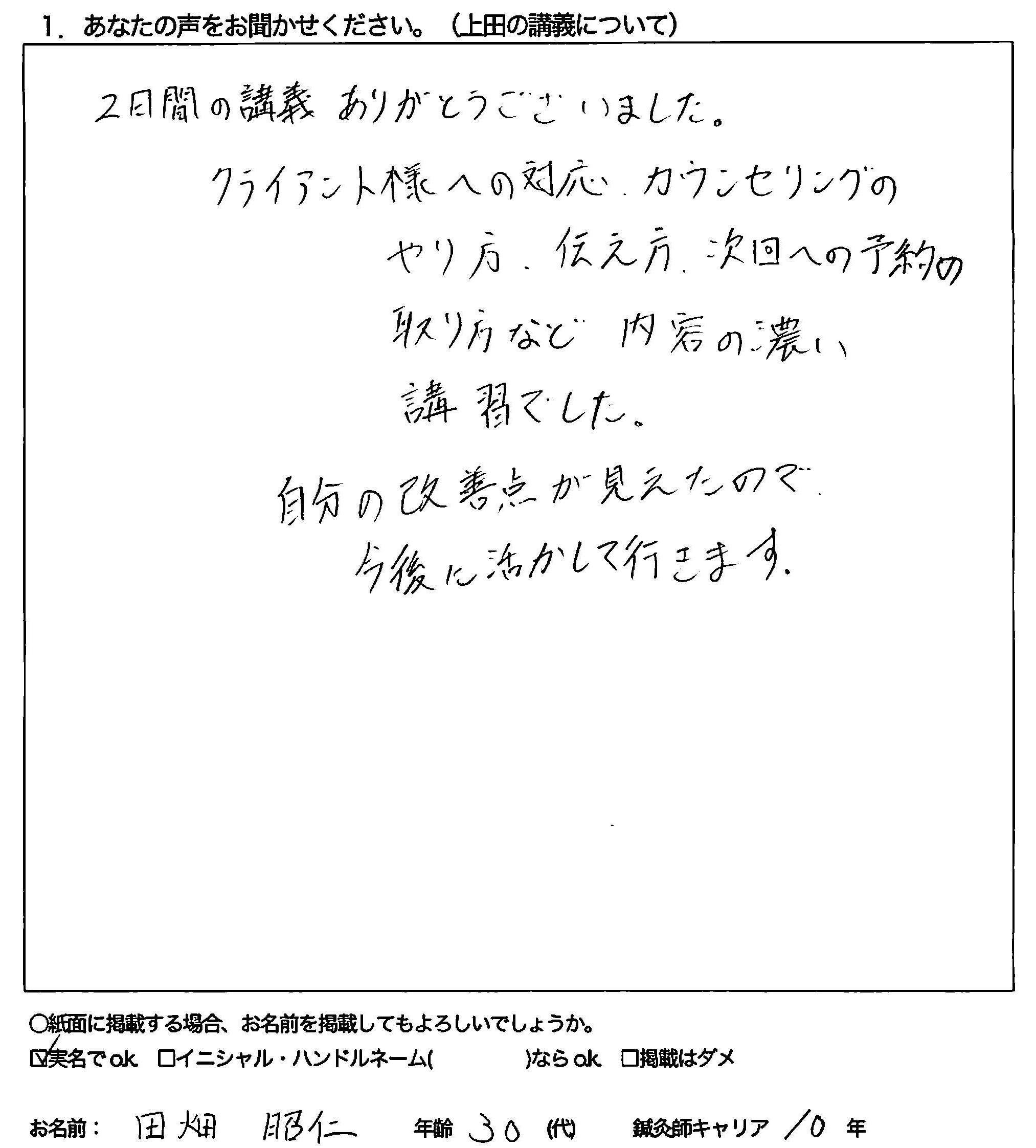 ![]() 二日間の講義ありがとうございました。クライアント様への対応、カウンセリングのやり方、伝え方次回予約の取り方など内容の濃い講習でした。自分の改善点が見えたので今後に活かして行きます。田畑昭仁様 |