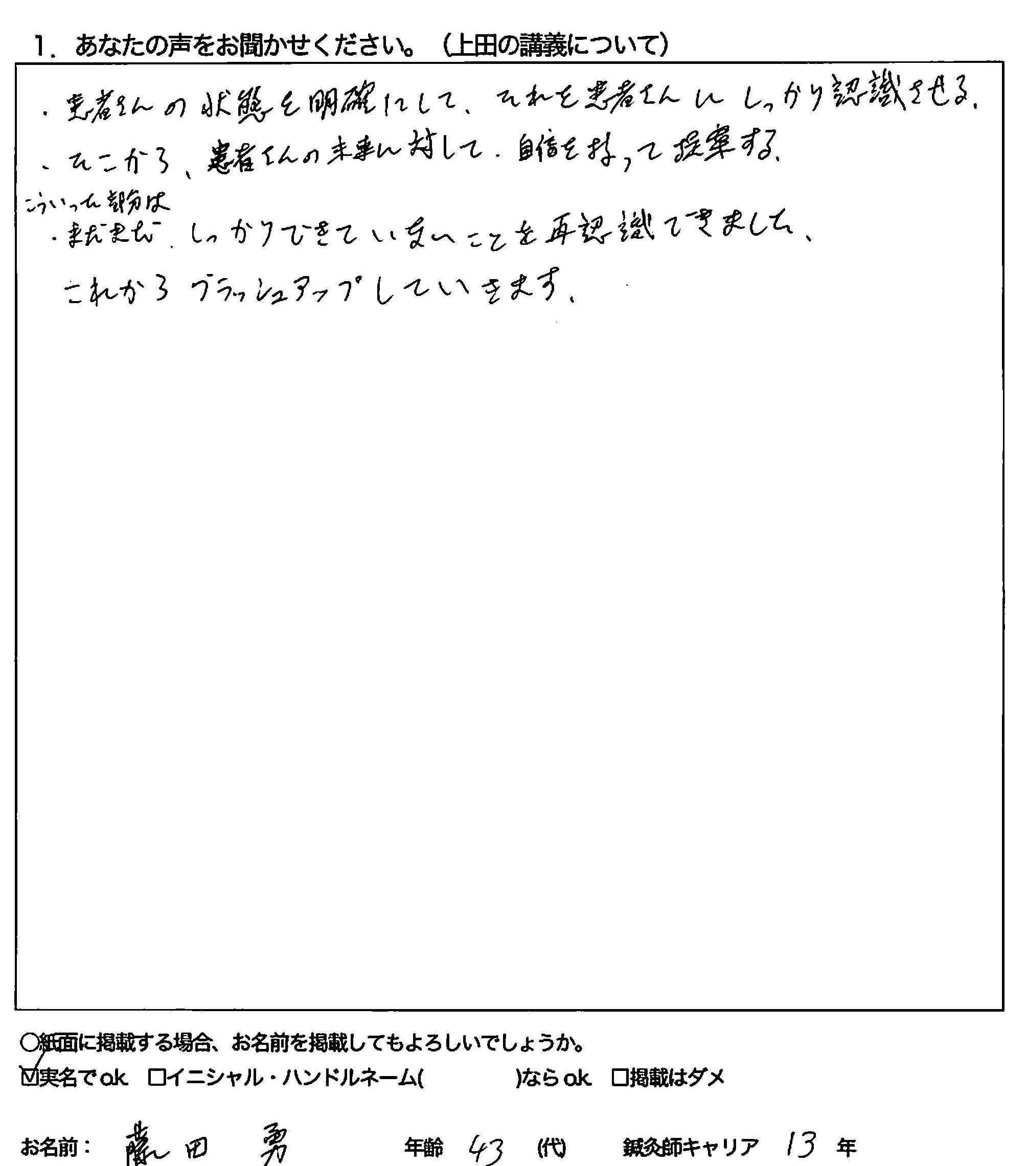患者さんの状態を明確に為て、それを患者さんにしっかり認識させるそこから患者さんの将来に対して自信をもって提案するこういった部分はまだまだしっかりできていないことを再認識できました。これからブラッシュアップしてきます。藤田勇様