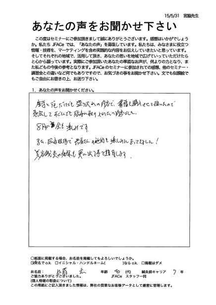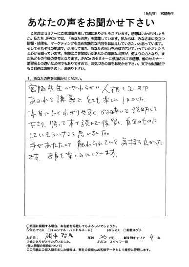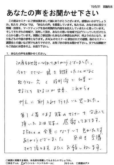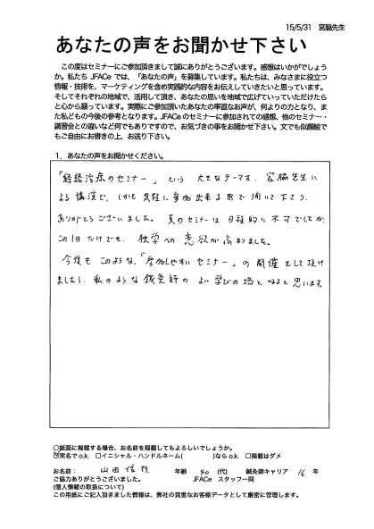 ![]() このたびお世話になりましてありがとうございました!今までささない鍼を経験したことがなく数少ない穴を弱刺激で効果がでることを、知ることができ、やり方に取り入れていきたいと思いました。 第一人者である先生のセミナーを企画していただいた上田先生には感謝しております。jfaceの会員になっていてよかったです、ありがとうございました。8月も受講させていただきます、よろしくお願いいたします。 |